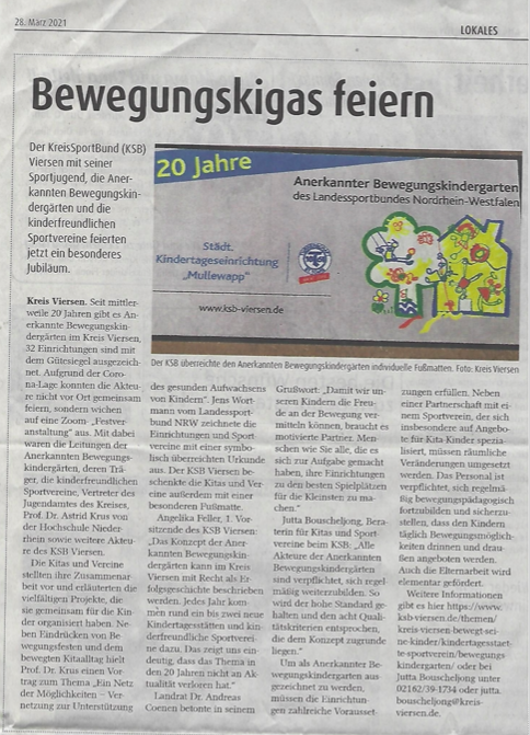 Seit mittlerweile 20 Jahren gibt es Anerkannte Bewegungskindergärten im Kreis Viersen. 32 Einrichtungen sind mittlerweile mit dem begehrten Gütesiegel ausgezeichnet. Um dies angemessen zu feiern, fand eine "Online-Festveranstaltung" statt. Alle weiteren Informationen können Sie dem rechts aufgeführten Presseartikel entnehmen.
