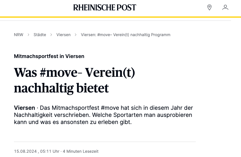 Das Mitmachsportfest #move hat sich in diesem Jahr der Nachhaltigkeit verschrieben. Welche Sportarten man ausprobieren kann und was es ansonsten zu erleben gibt, wird ausführlich im Pressebericht in der Rheinischen Post beschrieben.