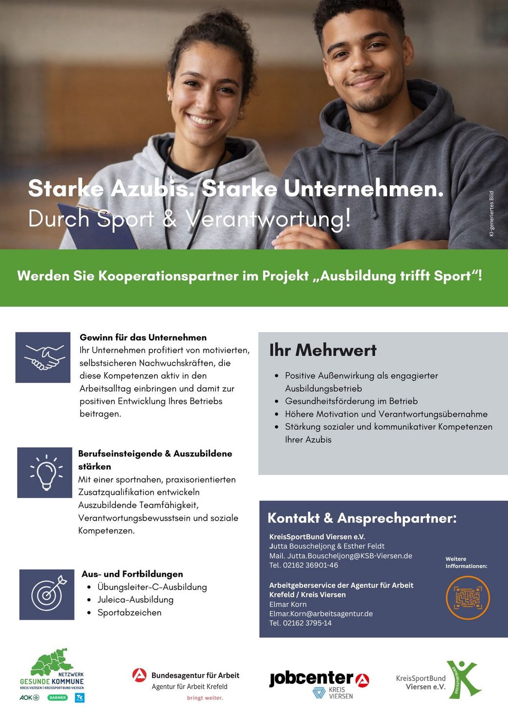Das Pilotprojekt „Ausbildung trifft Sport“ bringt Unternehmen, junge Menschen und regionale Partner aus Ausbildung und Arbeitsmarkt zusammen. Unser Ziel: die Ausbildungsqualität stärken, die Persönlichkeitsentwicklung fördern und Jugendliche ganzheitlich auf ihrem beruflichen Weg begleiten.
