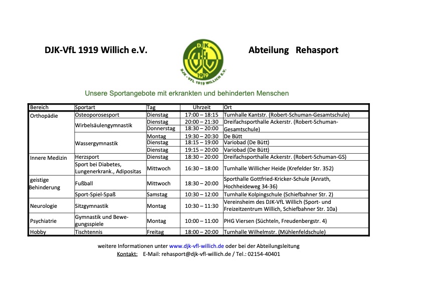 Der DJK-VfL 1919 Willich bietet in seiner Rehasportabteilung ein breites und qualifiziertes Sportangebot an, das für alle behinderten und erkrankten Menschen offen ist. In der Übersicht ist das aktuelle Sportangebot der Rehasportabgteilung aufgelistet.