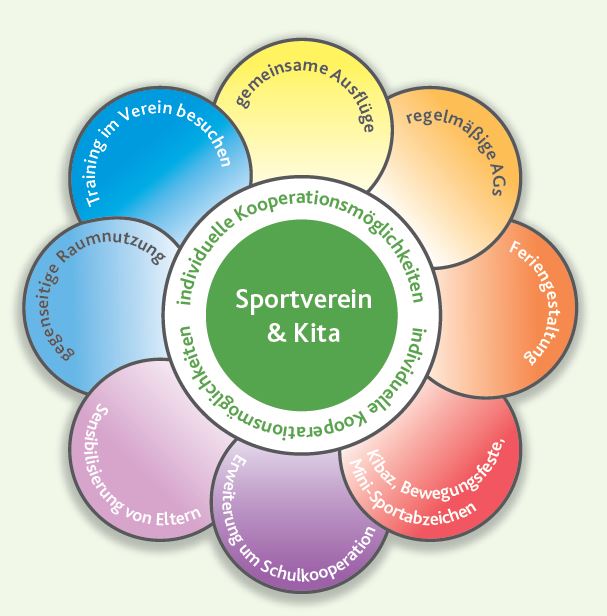 „Bewegung“ sowie „Körper, Gesundheit und Ernährung“ sollen als zwei zentrale Bildungsbereiche besonders betont werden. Dies ist nur möglich, wenn Sportvereine mit anderen Bildungs- und Betreuungseinrichtungen kooperieren.
