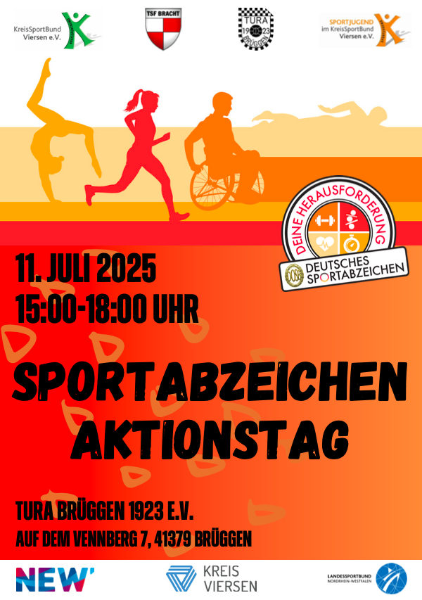 Der KreisSportBund Viersen e.V. veranstaltet zusammen mit der TuRa Brüggen 1923 e.V. am Freitag, den 11.07.2025 einen Sportabzeichen-Aktionstag (Auf dem Vennberg 7, 41379 Brüggen).